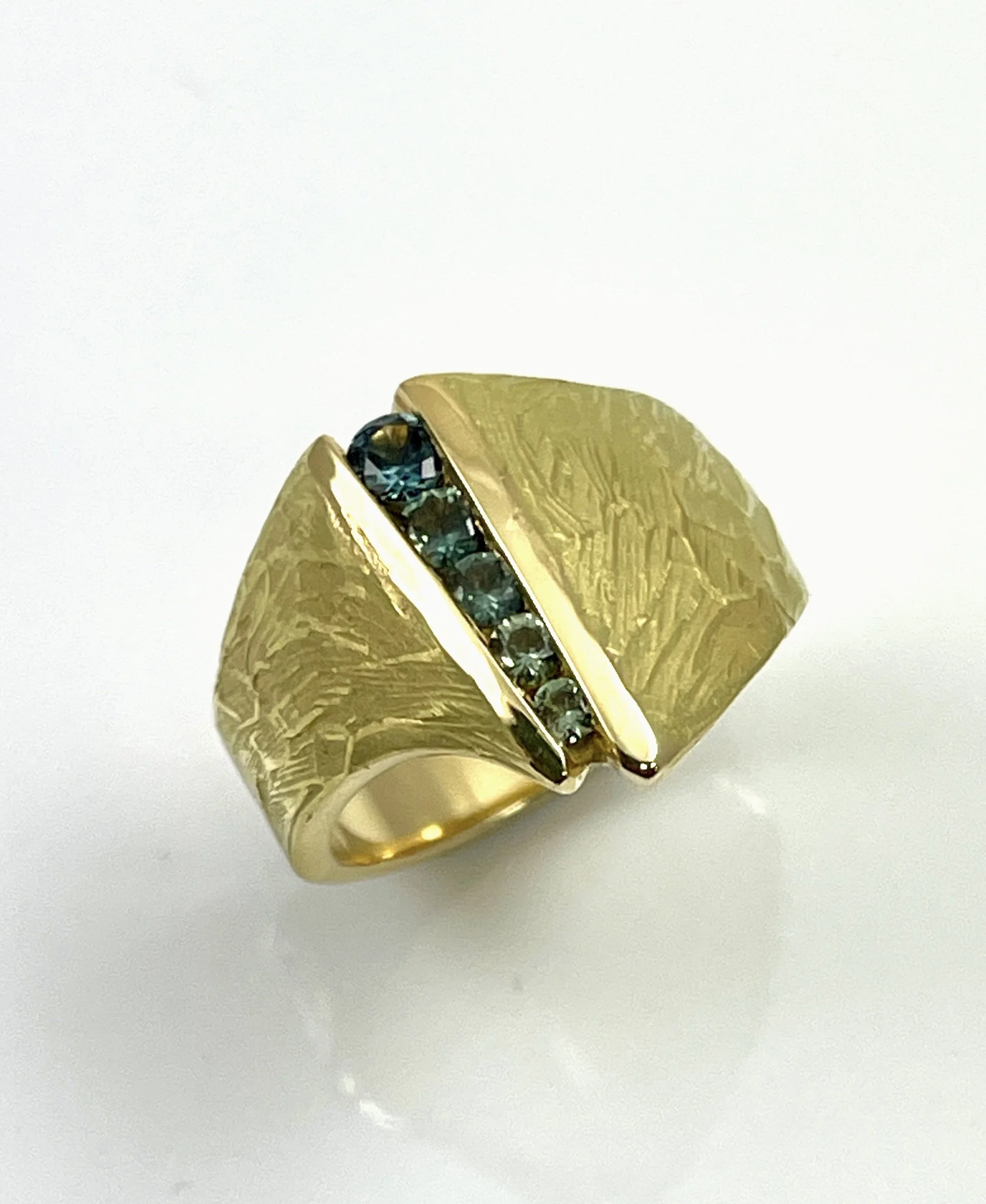 Windswept band set with 0.40ct total weight teal sapphire fade set in 18K. Custom