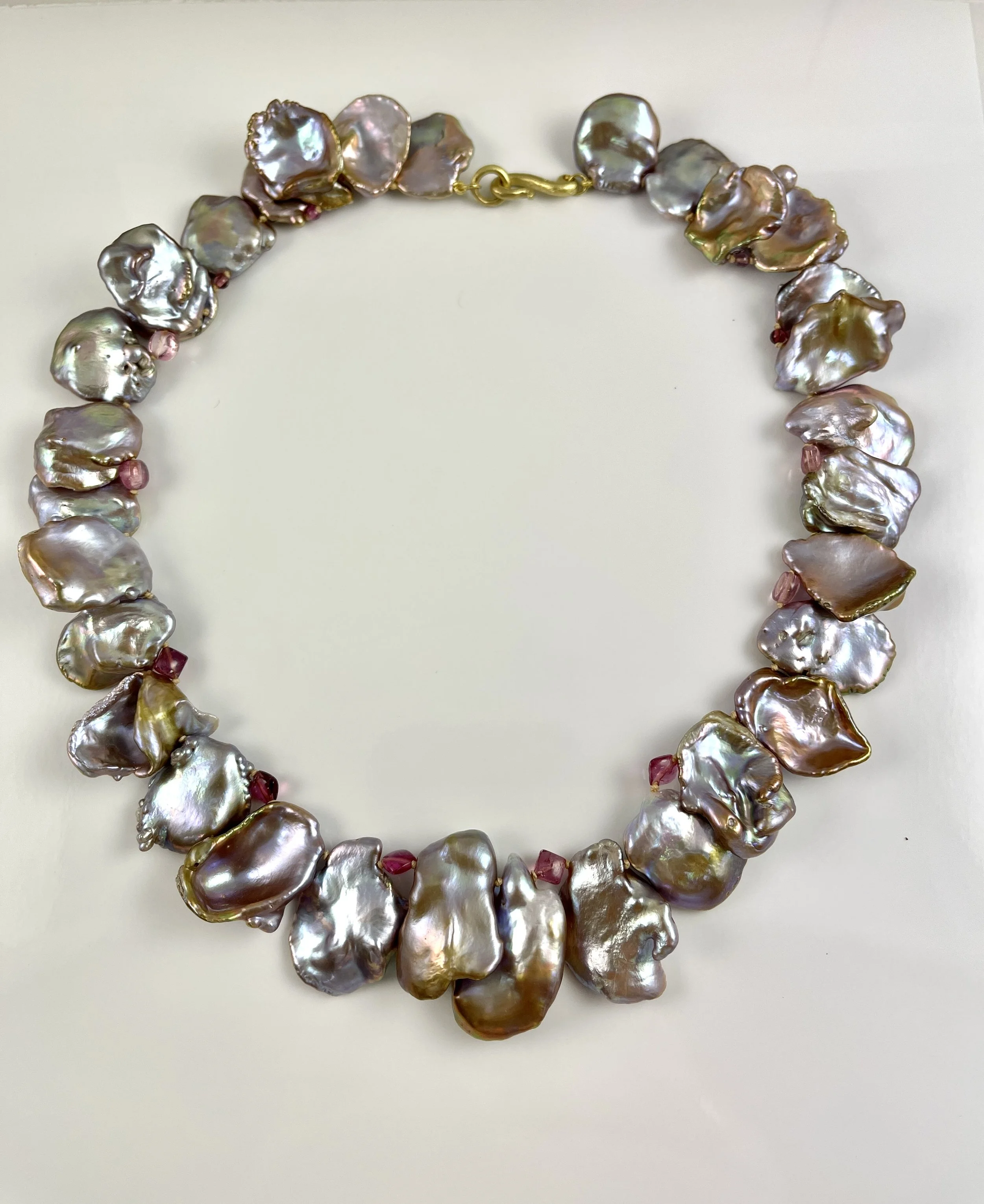 Lavender blush keshi necklace accented with 15 pink tourmaline beads. The 18K clasp is the Etruscan style Hook and Eye.
