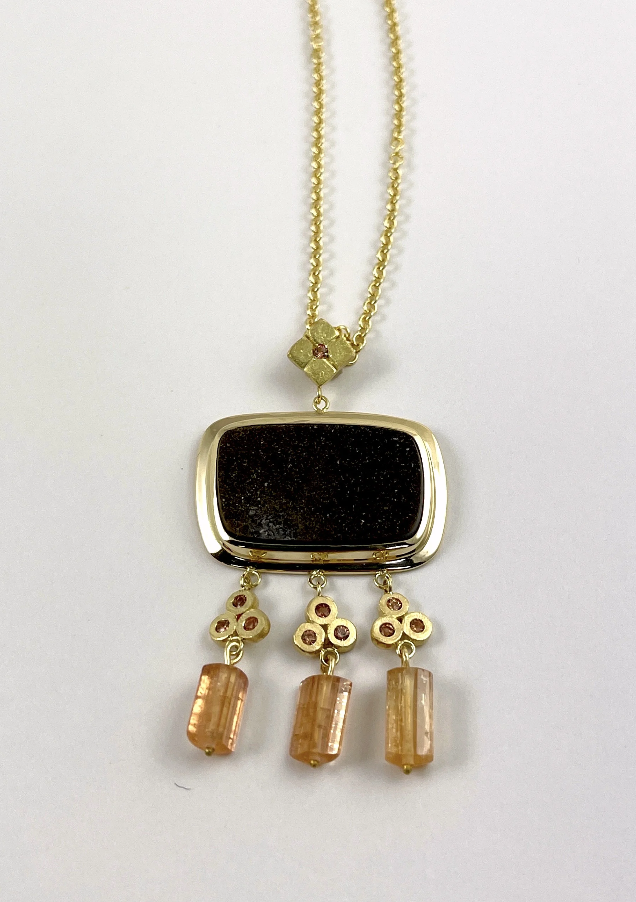 One of a kind, Chocolate Drusy agate pendant set in a 14K bezel, accented with Precious Topaz crystals and 10 Peach Sapphires set in 18K. The 18K 24" cable chain is optional.